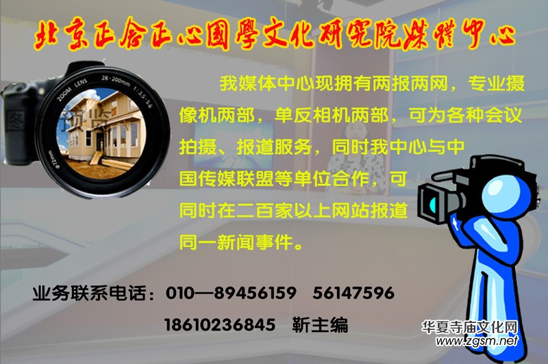 北京正念正心國(guó)學(xué)文化研究院媒體中心現(xiàn)擁有兩報(bào)兩網(wǎng),專業(yè)攝像機(jī)兩部,單反相機(jī)兩部,可為各種會(huì)議拍攝、報(bào)道服務(wù),同時(shí)我中心與中國(guó)傳媒聯(lián)盟等單位合作,可同時(shí)在二百家以上網(wǎng)站報(bào)道同一新聞事件。