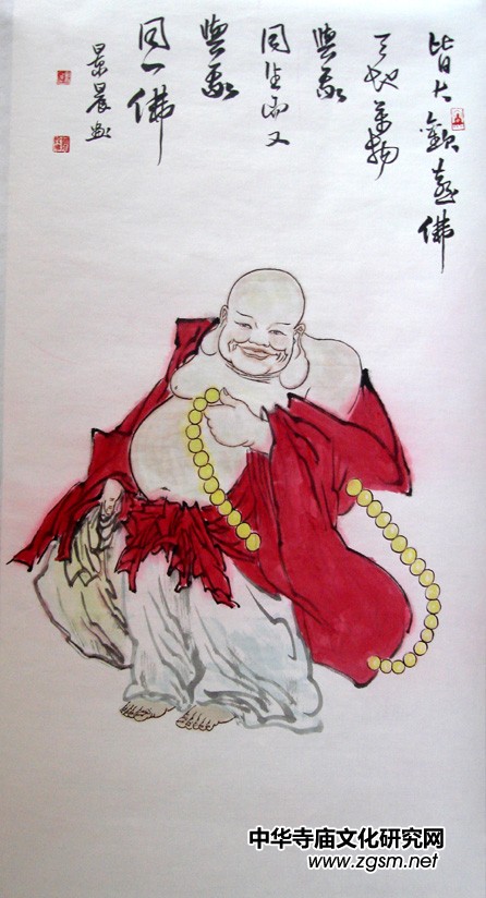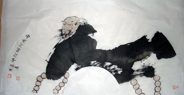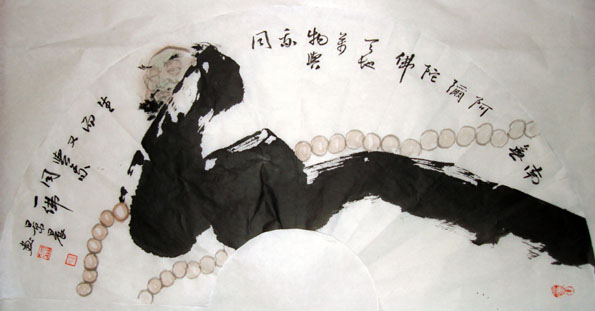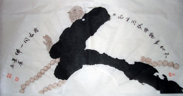 在《天地萬物與我同生而又與我同佛》系列創(chuàng)作中,應(yīng)該說這一批作品是景晨將書法的“人”字,破墨與簡筆人物畫,以一當(dāng)十,既白當(dāng)黑,畫的扇面形式,揉為一體,創(chuàng)造出了另一番大寫意人物畫風(fēng)格的突破性嘗試,物我兩忘,象外之象,畫之韻,人物造像,用筆用色頗現(xiàn)老道而自信,佛之氣息與天地共呼吸,陶醉于淋漓酣暢的情境中,乍看為書,二看為畫,三品書畫文心交融,空白的極妙設(shè)置經(jīng)營,為讀者預(yù)留了極大的補充空間,為傳統(tǒng)精神當(dāng)代心性之寫照。飄逸的佛珠與羅漢佛在視覺設(shè)計的多時空轉(zhuǎn)換,使畫面既有時間的延續(xù),也有四維,五維空間的音樂節(jié)奏變化,佛造像在字形,人字形的起筆藏鋒,抑揚頓挫中,把書法的抽象美與國畫畫面的黑白灰相得益彰,其中佛手勢的力量和指向性,布下了一個行進中的佛之流動空間,現(xiàn)代藝術(shù)視知覺之虛形與實形,圖與底的關(guān)系,在此幅詮釋了中國話語。