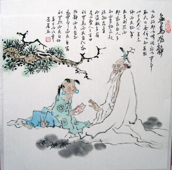 吳景晨人物畫中,表現(xiàn)出他對中國傳統(tǒng)人物繪畫的師承,對西方繪畫的融化,對現(xiàn)代構(gòu)成的運用,因為在吳景晨學(xué)畫的歷程中都不同時期、不同程度地對油畫和設(shè)計進行過實驗,就這批佛、道博古幽深的作品中,我們聆聽到,群山苦禪,品茶論道之高古今論,在借古人古語中,我們解讀到當(dāng)代人物畫的精神實質(zhì),無論在畫畫氣質(zhì)的營造上,從造景造勢,再由造勢到造情,聲勢浩蕩,氣韻貫通,編款布白,既白當(dāng)黑上,反映出吳景晨駕馭詩、書畫,接博古,鑄當(dāng)代的才情和學(xué)養(yǎng)!独献臃夂睢返膶懸,布白,設(shè)色與用線紅綠對照,干勾濕潤、寫染石的平和,以古典般橫臥,與被封的“侯”的假借,從形式上看,題字偏跋的錯落與入木端莊的瘦金書的山巒起伏,形成空形與實形的對比,將博大、高古的‘厚德載物,得道多助’的理念以現(xiàn)代闡釋!段钍种旋敗肺覀冏⒁獾絽蔷俺康拇髮懸饣B的蒼勁瀟灑的用筆,將石如松,松如石的盤龍般遒勁的張力,與老子在對視神龜時的寧靜致遠,形成和諧中對比,畫面幾點重墨如老子座臥的身姿的三角形延伸,使石與人,人與石品格、形式相統(tǒng)一。而童兒發(fā)際的橫向強調(diào),與青石的輪廓勾勒,一張一弛,畫眼與思想情,借甲骨文的朱刻雋永與神壽金龜?shù)拈啔v世事,在唯美、潤物的覺悟中,傳達一種超凡脫俗的文化內(nèi)涵。我們注意到,吳景晨把山水中的美學(xué)本體“道”,運用于人物畫中,將大寫意花鳥畫中的“逸”態(tài),注入人物畫的“勢”中,反映出吳景晨在文化內(nèi)涵上的一貫性和融會貫通。