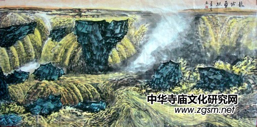 《南無阿彌陀佛》取書法中的飛白,充分利用石分三面的中國造山造石之論,以別具形式,別具創(chuàng)意的極簡造型,在人物畫與書法“筆畫”簡畫中得到了有益的推進。人物造像與構(gòu)圖的突破,在于吳景晨的破墨簡筆與佛之環(huán)宇山河與佛涅槃造型姿勢,將大寫意潑墨的文心,與佛之靜心覺悟的圣心疊加,使畫幅別開生面,山亦佛,佛亦是山,數(shù)筆寥寥,精氣神俱佳,墨韻氤氳,干濕有度,抽象與具象,氣象萬象于山色有無之中。隔岸觀佛,山的那邊是凈土,一心向佛,山的這邊是世事,山與日出震旦,佛珠有靈性聞佛語而靈動,打坐參禪,法度無量,剛?cè)嵯嚅g,佛與山,佛與太陽重復(fù)著圓滿的輻射波,大河落日,佛語又起,天人佛合一的永恒大美。作為佛教造像的繪畫語言,顯然,吳景晨這一系列作品集梁楷簡筆佛,吳道子道釋風(fēng)范,道畫寫意山水的空靈與出世,與當(dāng)下新文人畫和實驗水墨的開拓之大成,可謂之文心釋放,道法自然之新文人畫書寫與撼動。這種隔岸觀佛的形式美與深刻和巧妙的佛家睿智正是吳景晨長期修行,一心向佛的覺悟藝愉。在吳景晨的羅漢人物畫中,我們注意到了作者對釋家參禪境界的渴望,在山水畫中也蘊含著此等釋道相合的宗教理想。