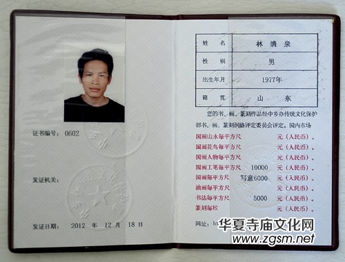 林清泉,1977年生,山東臨沂人,大專文化,自幼酷愛書畫,山水、花鳥、人物三科的功底都相當(dāng)扎實(shí),能工能寫,能書能文,其中尤擅工筆,近十幾年來主要致力于敦煌、永樂宮、法海寺等壁畫的臨摹、創(chuàng)作與研究,臨摹壁畫數(shù)百平方米,其作品曾被日本駐中國大使館、全國多家寺廟、法師、中國人權(quán)基金會(huì)、天津人民美術(shù)出版社等國內(nèi)外社團(tuán)及個(gè)人收藏。出版有《林清泉的壁畫藝術(shù)》、《林清泉壁畫作品集》。其作品在首屆中國寺廟文化書畫對(duì)聯(lián)詩文大賽中獲書畫組特等獎(jiǎng),并授予‘中華善文化傳播杰書書畫家。