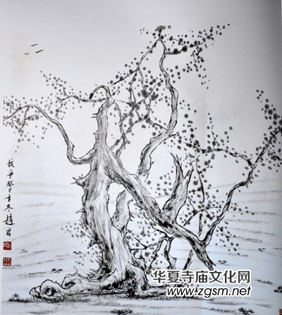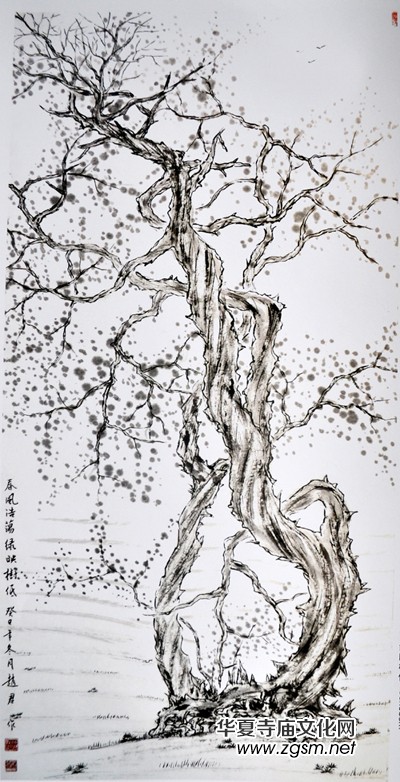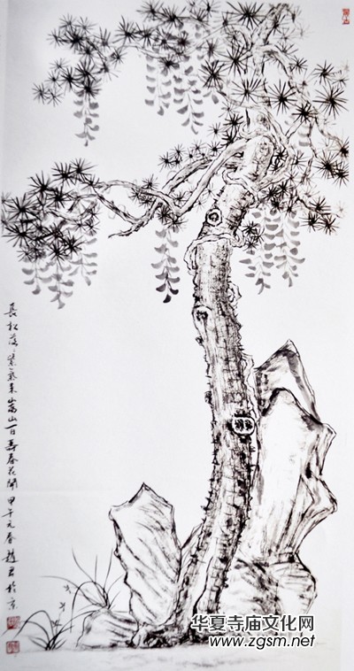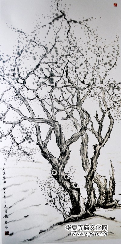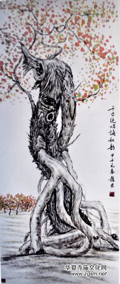 趙君先生熱愛生活,提倡保護(hù)自然,對破壞自然,砍伐森林給人類造成的后果,深表憂慮。為此趙君先生認(rèn)真考察祖國各地的老樹、古樹樹生長的情況,經(jīng)過現(xiàn)場寫生取景得到大量素材,先后刻畫了兩卷近50米的百樹圖,表現(xiàn)了古樹、老樹、枯樹、殘樹的真實(shí)情況,借此喚醒人們對自然的關(guān)注。