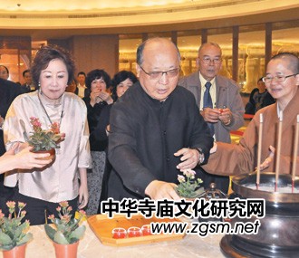 胡志強(qiáng)夫婦的皈依大典,由星云法師主持,兩人禮佛參拜,大師問(wèn)“是否皈依佛、法、僧?”兩人合掌答“是”。