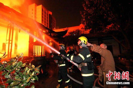 273時(shí)12分,位于福州年市區(qū)法海路1號(hào)的千年古寺法海寺發(fā)生火災(zāi),147名消防官兵在現(xiàn)場(chǎng)展開撲救,合理設(shè)置水槍陣地堵截火勢(shì)蔓延,保全了寺廟內(nèi)的大量經(jīng)書和文物。中新社發(fā) 容肖
