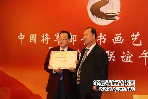 中國(guó)將軍部長(zhǎng)書(shū)畫(huà)藝術(shù)研究院院長(zhǎng)徐根初中將給廣西分院院長(zhǎng)吳建納頒發(fā)證書(shū)