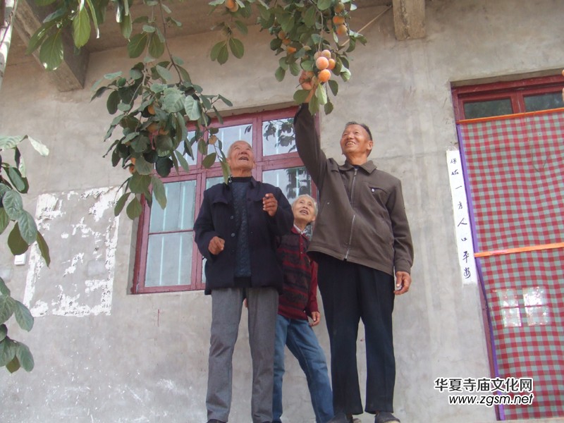 該寺院一老人在向兩位老人贊譽奇異的四個柿子