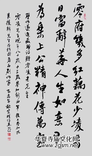 不管是文學(xué)還是書法藝術(shù),他都大膽開拓,努力創(chuàng)新。人生需要一顆強(qiáng)大的心,去發(fā)現(xiàn)心的思路與市場,走屬于自己的道路。詩文書畫于事業(yè)相融,這已是笑琰的人生與生活的組成,他說過:“歷史和祖先留給了我們不少的財(cái)富,那么,做為這個(gè)時(shí)代的文人,我們不能因?yàn)槿兆雍眠^了,富裕了就沒了使命感,是否也應(yīng)擔(dān)負(fù)責(zé)任,努力為后代留下一些寶貴的文化!北局@個(gè)理念,他一著努力著,今年8月成功地在佛教圣地五臺山啟動了“中華禪詩文化碑”功程,并將兩塊“中華禪詩文化碑”分別立在了五臺山清涼寺和南臺普濟(jì)寺。