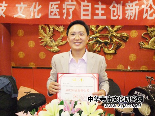 北京福禱平安酒業(yè)有限公司開發(fā)的大度尊酒榮獲科技創(chuàng)新金獎,圖為該公司總經(jīng)理趙友秀在領(lǐng)獎臺上