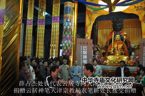 為迎接北京市佛教協(xié)會成立三十周年,云居寺在毗盧殿內(nèi)舉辦了“云居禪筆 結(jié)緣天下”捐贈活動,將云居禪筆作為開光專用筆,下一步,云居寺還要將禪筆向國內(nèi)外各大寺院贈送,真正實(shí)現(xiàn)云居禪筆結(jié)緣天下的美好愿望;顒又,北京市房山區(qū)民政局局長王占勇代表云居寺寺管會向北京各大寺院捐贈云居禪筆,北京市佛協(xié)秘書長劉燕梅女士代表北京各大寺院接受捐贈;北京市宗教局三處薛占杰處長,代表云居寺向天津各大寺院捐贈云居禪筆,天津宗教局農(nóng)筆耕處長接受捐贈。國內(nèi)外、港澳臺50余家媒體進(jìn)行現(xiàn)場報(bào)道。