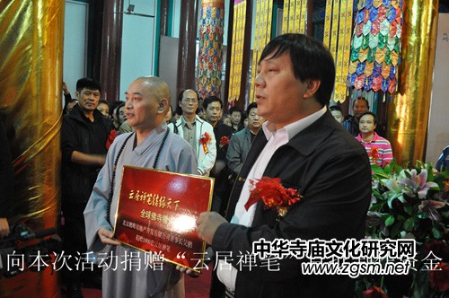 2011年9月18日下午2:00,云居寺毗盧殿內(nèi)將舉辦“云居禪筆全球佛教寺院贈送活動新聞發(fā)布會”捐贈活動;顒佑稍凭铀鹿芾硖幹魅卧乒饦s主持,由北京鵬輝房地產(chǎn)開發(fā)有限公司董事長吳鵬,向本次活動捐贈“云居禪筆”首批制作資金,監(jiān)院果堅(jiān)法師介紹“云居禪筆”并發(fā)布。